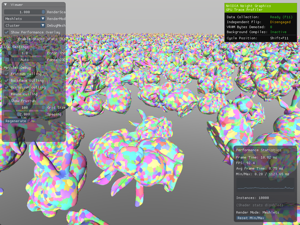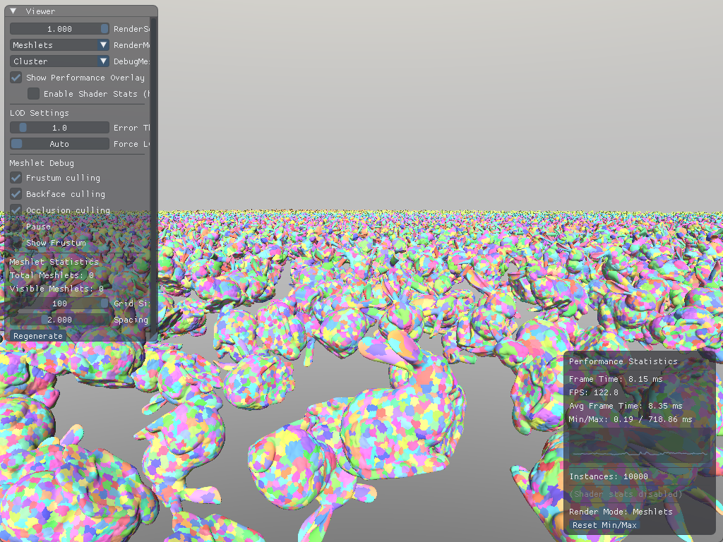 These are precisely the problems that Unreal Engine 5's Nanite set out to solve. Nanite is a virtualized geometry system that uses GPU-driven rendering, mesh clustering, and hierarchical LODs to render massive amounts of geometric detail without the traditional bottlenecks.[3] While I won't be replicating Nanite exactly (hence "at home"), the techniques explored here, meshlets, GPU culling, and seamless LOD transitions, form the foundation of such systems.