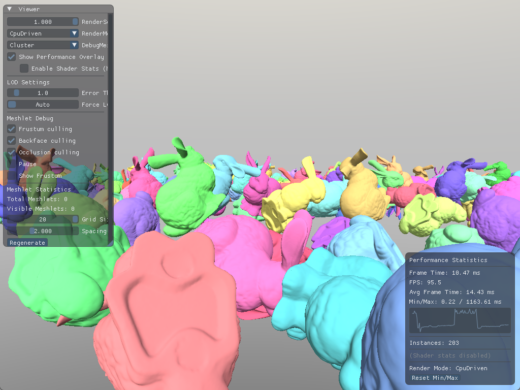 The CPU-driven pipeline supports merged mesh buffers, instancing and frustum culling. It is set up in a way that we can transition to GPU-driven smoothly.