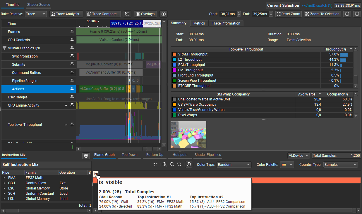instanceCount = 0don't rasterize anything, the GPU's command processor still has to parse and skip each one, so there is some overhead. VK_KHR_draw_indirect_count is the same as a normal draw indirect call, but “drawCount” is grabbed from another buffer. This makes it possible to let the GPU decide how many indirect draw commands to execute, which makes it possible to remove culled draws easily so that there is no wasted work.[7]
